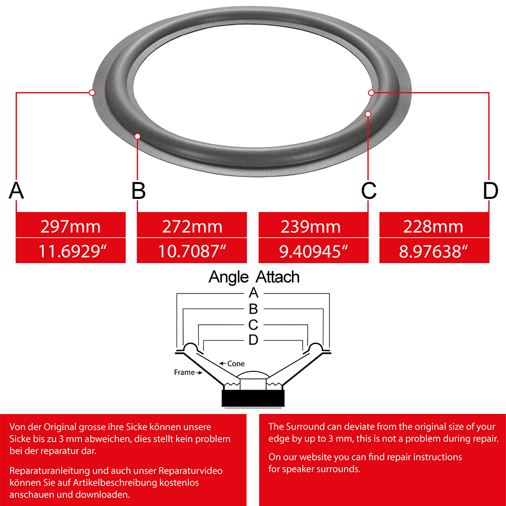 Please check the model and size of your speakers before placing your order to be sure you receive the correct Surround. The Surround can deviate from the original size of your edge by up to 3 mm, this is not a problem during repair.